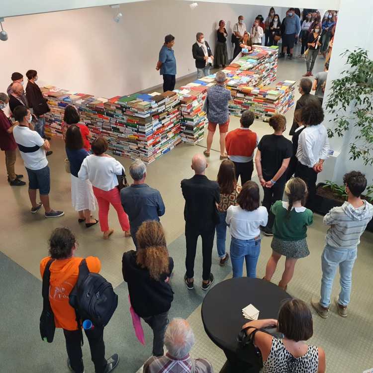Parmi les bâtis se trouve une œuvre composée de livres de la BU destinés au pilon, œuvre pensée par Étienne Poulle et montée avec des étudiant·e·s de l’Université et de l’École d’art et de design TALM.