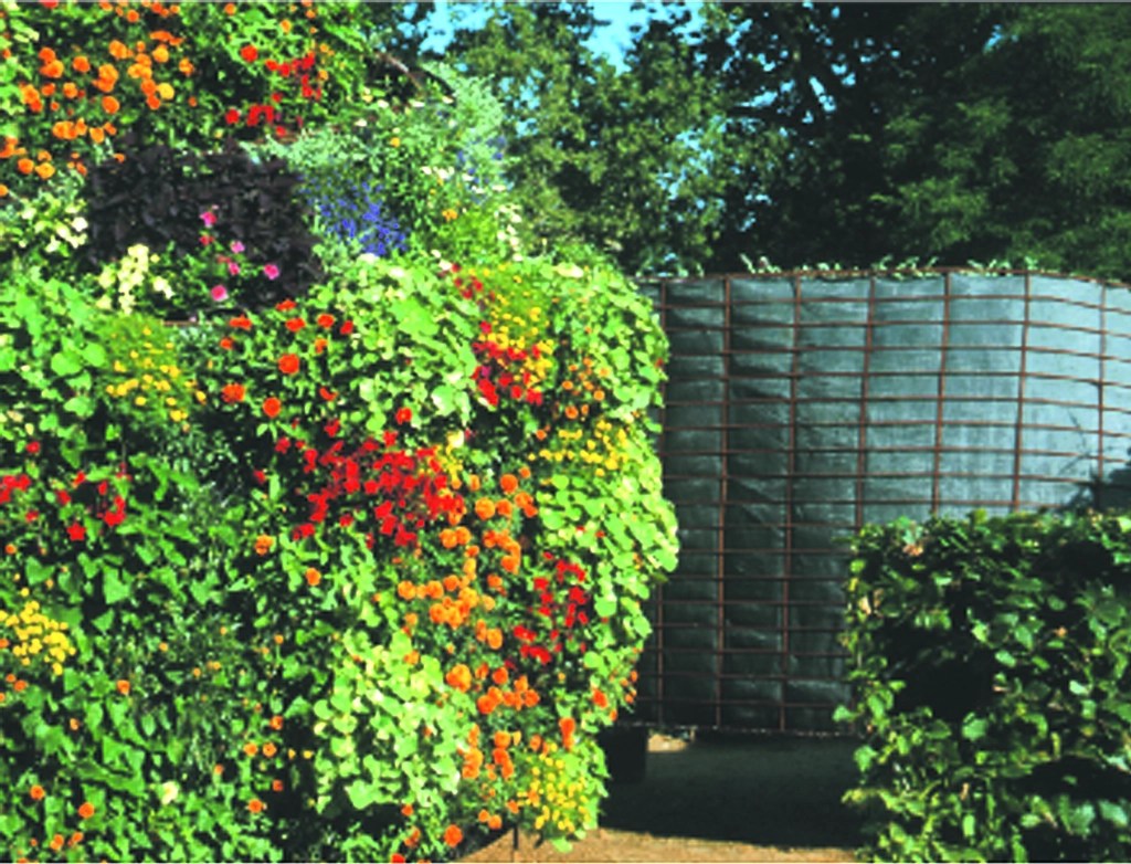 Jardin éphémère, surface de 250m2, structure métallique, panneaux composite : treille, textile, substrat végétal, hydratation, plantation.