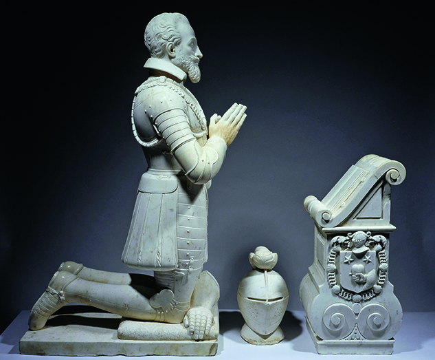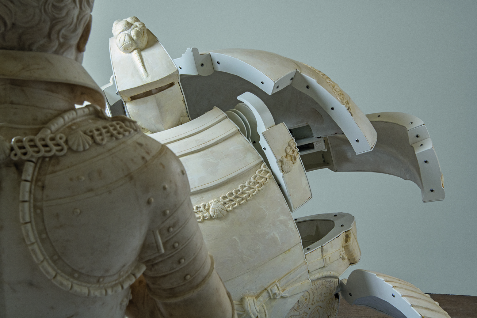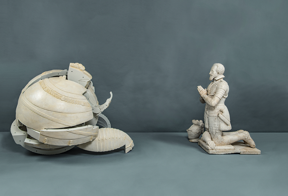 Il s’agit d’une sculpture hybride autour de la figure du chevalier, du héros invincible, associant deux de ses incarnations: la statue en marbre de Donadieu de Puycharic, forte et intimidante par son esthétique classique, son lien au passé; et celle, très accessible, des Bakugans©, petits jouets guerriers, vifs et colorés, liés à la culture mangas et à l’ère industrielle.